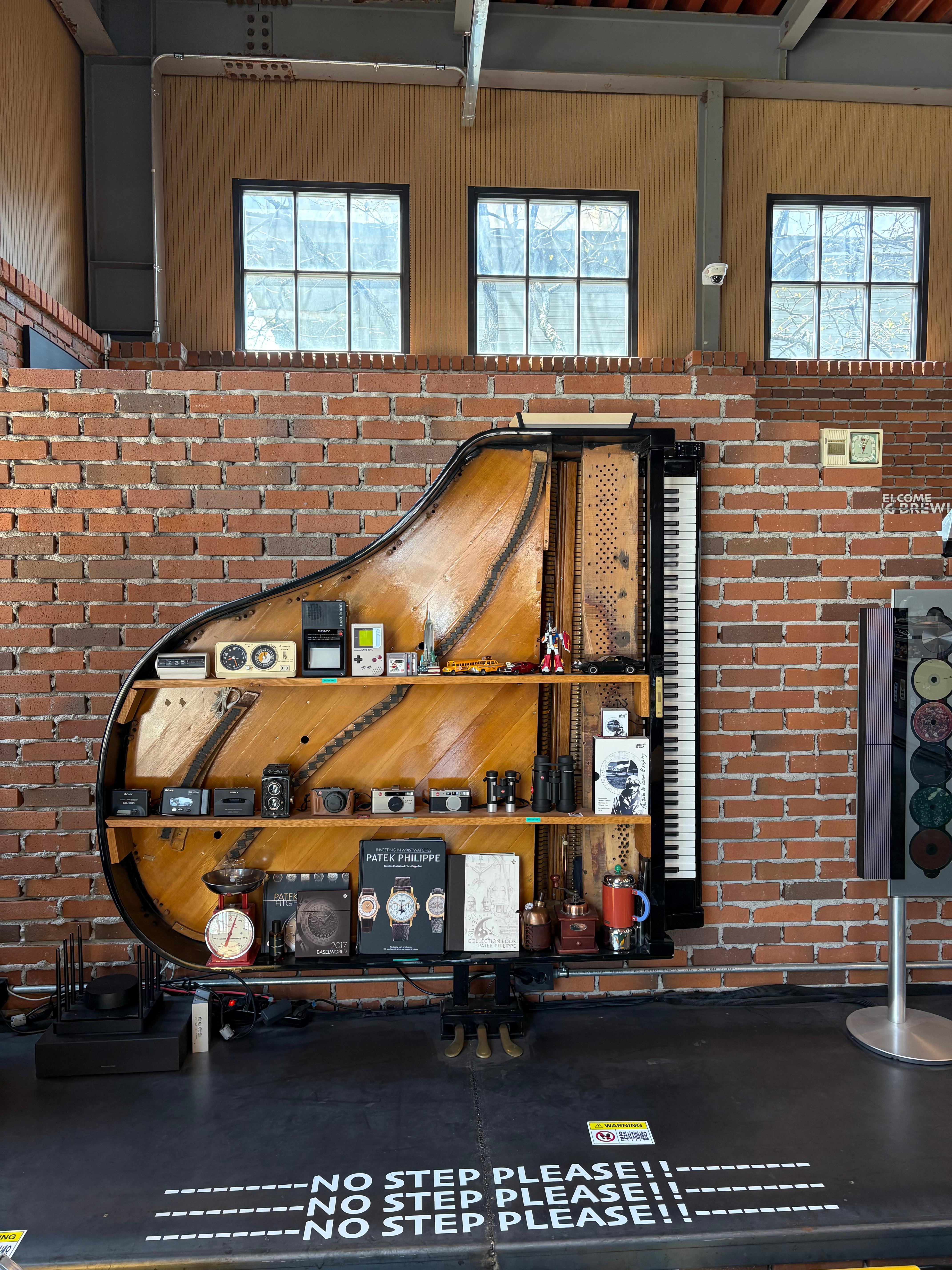 카페 한쪽에 진짜 피아노를 반으로 잘라 만든