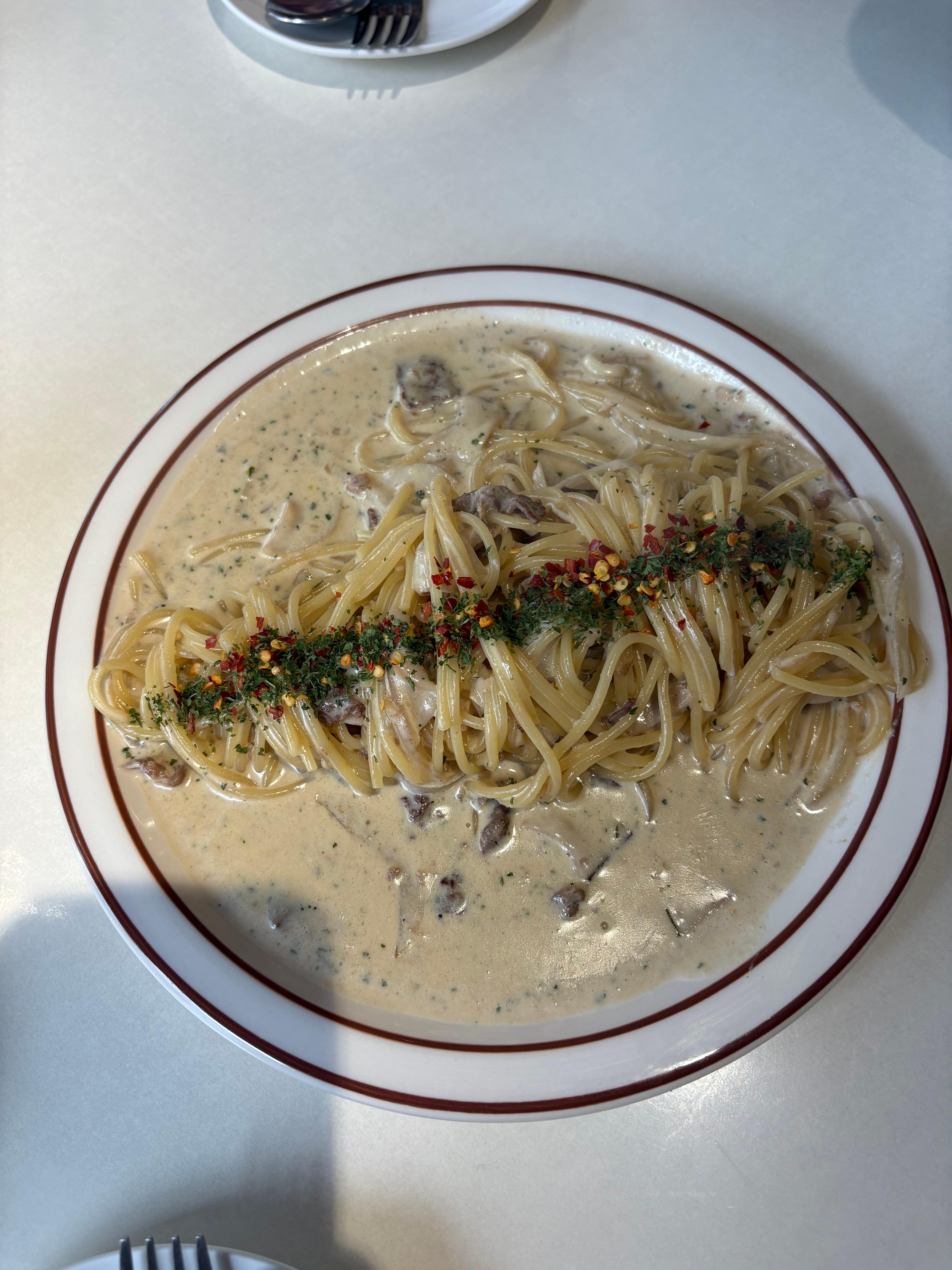 비프 크림 파스타는 정말 꾸덕꾸덕하고 고소했어요!